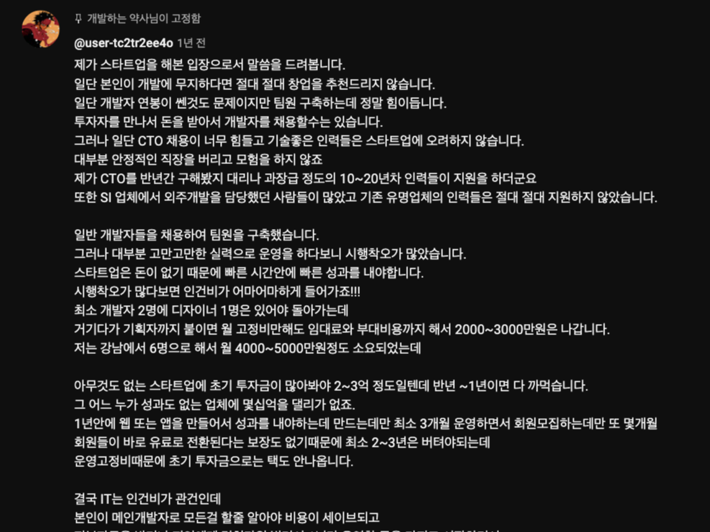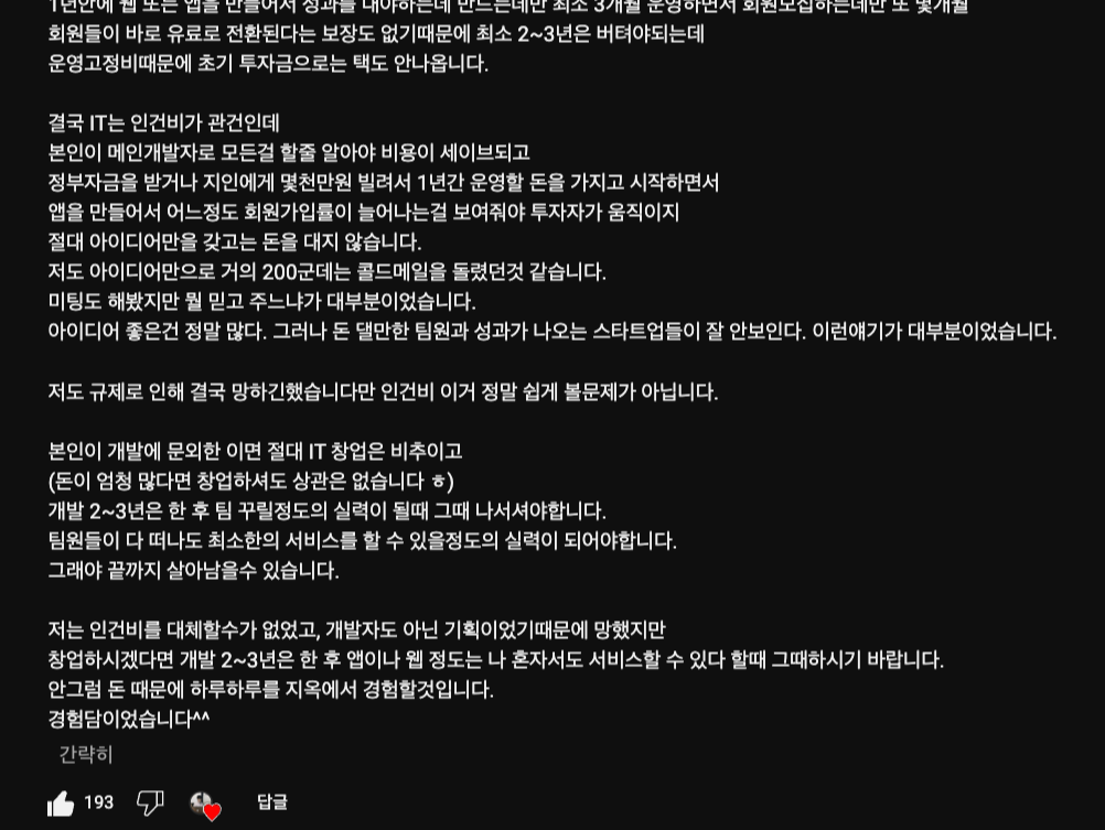 - 이런 상황이라 본인이 메인 개발자로 모든 것을 할 줄 알아야 비용이 절약되고, 어느 정도 결과물을 가지고 투자자에게 보여줘야 투자금을 받을 수 있음. 아이디어만으로는 투자를 받아내는 것이 보통 쉽지가 않음.