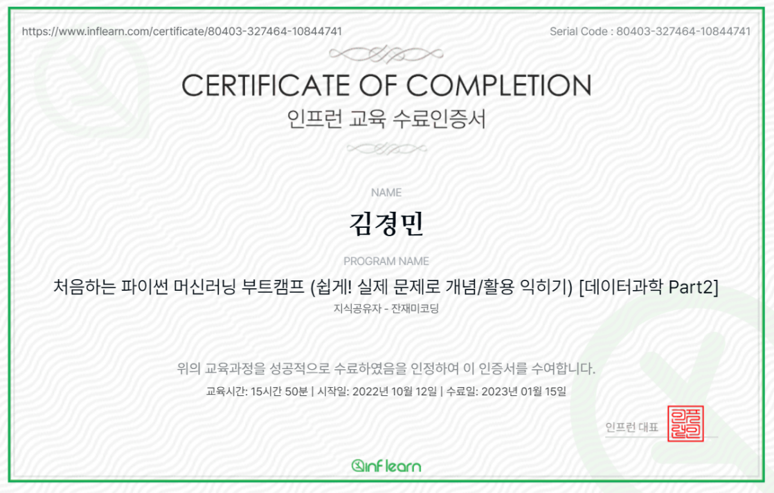 Inflearn을 통해 수강하던 머신러닝 기초 강의 수강을 끝냈다. 전체 시간은 15시간이지만, 공부에 대한 몰입 부족 및 이해 부족 등으로 생각보다 시간이 소요됐다. 크게 분류 모형, 회귀 모형, 군집 모형을 기준으로 머신러닝을 돌려보는 방법에 대해서 배운 것 같다. 이걸 이제 회사 업무에 적용해보고 유의미한 것들은 리포팅이나 공개적으로 적용해봐야겠다.