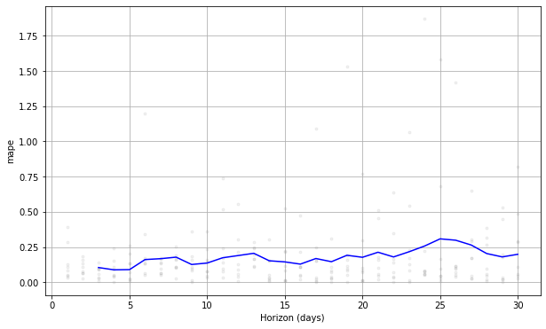 plot_cross_validation_metric(df_n_cv, metric='mape')은 cross_validation 함수를 통해 생성된 교차 검증 결과인 df_n_cv를 활용하여, 모델의 성능을 시각화하는 함수다. metric 인자를 통해 어떤 성능 지표(mae, mse, rmse, mape, mdape)를 사용할 것인지 설정한다. plot_cross_validation_metric 함수는 예측 결과와 실제 값의 차이(mape)를 바탕으로 교차 검증 결과를 시각화한다.